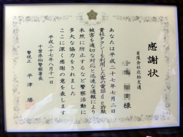 - 先般、弊社のタクシーに、ご乗車されたお客様のお話の内容に違和感を感じたので、そのまま柏警察署へお客様をお連れしました。その結果、振り込め詐欺に遭うところを、弊社の乗務員の機転で未然に防ぐことができました。