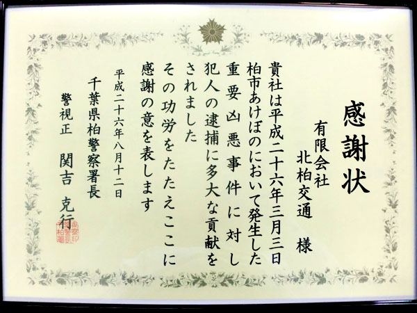 - この件でも、柏警察署長より感謝状を授与されました。
